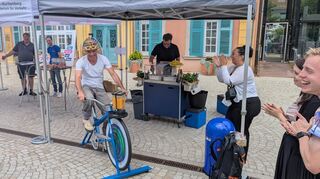 Spricht‘s und steigt schwungvoll auf das Smoothie-Bike, das sie noch von der BUGA23 in Mannheim kennt. Einen „Traumfigur“-Smoothie sucht sie sich aus – gemischt aus Mango, Aprikose, Maracuja und Sanddorn. Nach ein paar kräftigen Tritten wird sie mit dem fruchtigen Mix belohnt und schaut auf den ruhig dahinfließenden Verkehr in Höhe des Schlossplatzes. „Noch vor ein paar Jahren hätten wir uns hier nicht unterhalten können“, bemerkt Elfriede Fackel-Kretz-Keller. Da sei es viel zu laut gewesen. Wolfgang Leberecht gibt zu bedenken, dass die örtliche Gastronomie bei aller Verkehrsberuhigung schon auch Wert darauflege, den Autoverkehr in der Innenstadt zu halten. Für Elke Zimmer ist das kein Widerspruch. „Es geht nicht nur darum: entweder das eine oder das andere. Was wir brauchen, ist ein ausgewogenes Verhältnis – die gleichberechtigte Teilhabe am Verkehr von allen.“