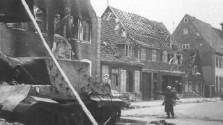 Bereits kurze Zeit später hörte und sah man, wie sich ein deutsches Sturmgeschütz an der katholischen Kirche in die Dreikönigstraße vorwärts bewegte und langsam in Richtung der Heidelberger Straße rollte. In Höhe der Kleinen Planken und dem Eckhaus zur Dreikönigstraße (Möbel Schweinhardt, später unter anderem Eiscafé, heute leerstehend) hatten sich bereits zwei amerikanische Panzer in den Hinterhalt gestellt, und kurz vor dem Haus der Familie Krebs wurden dem deutschen Sturmgeschütz zwei Treffer aus kurzer Nähe verpasst. Der eine traf die Panzerkette und machte das Sturmgeschütz manövrierunfähig.