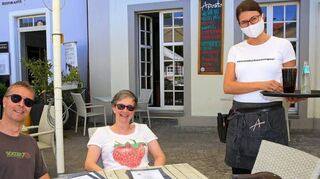 Auf dem Schlossplatz wischt eine Kellnerin des Kaffehauses mit Desinfektionsmittel die Tische und Armlehnen von Stühlen ab, bevor die nächsten Gäste platziert werden. Dabei trägt sie einen Mundschutz. Damit empfängt sie auch Steffi und Daniel Günter aus Wiesenbach, die bei dem herrlichen Wetter nicht lange zögerten und ihre beiden kleinen Töchter Frieda und Rosa einpackten, um sich eine kühle Erfrischung im Außenbereich des Kaffeehauses zu genehmigen. Daniel Günter ist sehr froh, dass er mit seiner Familie wieder in die Restaurants gehen beziehungsweise draußen sitzen darf. „Wir haben wirklich schon sehnsüchtig darauf gewartet, mal wieder rauszukommen und ein wenig Sonne zu tanken“, erzählt er unserer Zeitung. „Klar, es ist schon eine Umstellung, aber die Atmosphäre hier im Vergleich zu daheim ist einfach eine ganz andere“, so der Familienvater. Rosa spielt mit einem Bierdeckel während ihre ältere Schwester Frieda auf ihrem Stuhl herumklettert. Stören die Hygienemaßnahmen, die beachtet werden müssen, wie die Masken so lange zu tragen, bis man am Tisch ist? „Also ich habe damit überhaupt keine Probleme, da wir ja draußen sitzen und hier ist ja schon viel Platz, um Abstand halten zu können“, berichtet Steffi Günter.