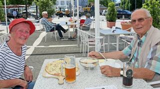Ein paar Meter weiter, vor dem Brauhaus zum Ritter, haben sich zur Mittagszeit Gäste niedergelassen. Zuvor haben sie sich die digitale Speisekarte angeschaut, die sie über ihr Smartphone per QR-Code abrufen können, und sich für ein Gericht entschieden. So ist es vorgeschrieben. Sigrid und Herbert Lehmann, die seit 1967 in Schwetzingen leben, feierten in gediegener Zweisamkeit hier ihren 63. Hochzeitstag. Wie fühlt es sich für die beiden Schwetzinger an, nicht mehr nur daheim essen zu müssen und sich auch mal wieder bewirten und bekochen zu lassen? „Wir haben lange darauf gewartet und uns ist es sehr schwer gefallen, vor allem, da wir solche Ausflüge auch immer mit einem Spaziergang in den Schlosspark verbinden“, erzählt Herbert Lehmann. Die beiden haben eine Dauerkarte für den weitläufigen Garten und konnten sie – wie viele andere Besucher – lange nicht benutzen. Schon bringt die Kellnerin des Brauhauses dem Ehepaar einen Spargelflammkuchen und eine duftende Spargelcremesuppe, die sich die beiden bei Sonnenschein und Bier schmecken lassen.