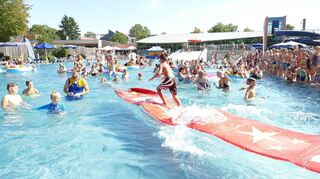 Trotz der Schließung des Hallenbades aufgrund von Revisionsarbeiten von 24. Juli bis 10. August konnte eine hohe Besucherzahl erreicht werden. Der am besten frequentierte Tag war der Brezelfestsonntag, 9. Juli, mit 3759 Gästen. Kein Wunder, das war auch ein echter Hitzetag. In den letzten Tagen kamen wegen der schlechteren Witterung nicht mehr so viele Menschen ins Bademaxx – so zum Beispiel am Dienstag 1094 und am Mittwoch 842. Durchschnittlich besuchen etwa 300 000 Personen im Jahr Hallenbad und Freibad sowie 50 000 Gäste die Sauna. Unser Bild zeigt ein Highlight der Sommersaison: Die Pool-Party mit dem Zephyrus-Team.